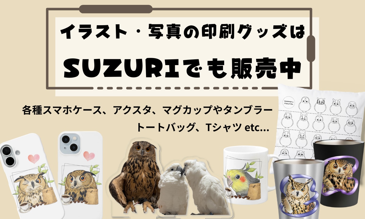 リンクはこちら→https://suzuri.jp/hsk_owl_0v0(ショップ内にもSUZURIへのリンクが貼ってあります)