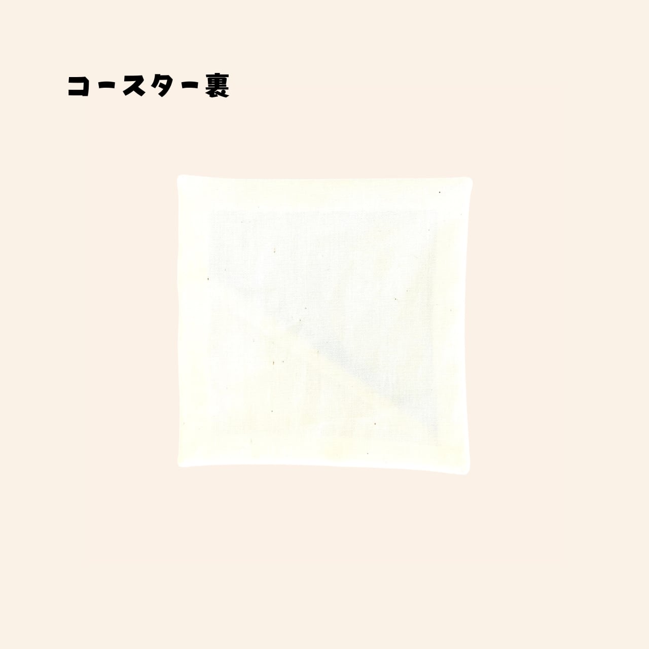 *イラスト部分はアイロン転写シートを使用しております。通常の洗濯(洗濯機を使用した洗濯)は可能ですが、印刷面を強く擦らないようご注意ください。また、アイロンをかける際にはイラスト部分は当て布をする、もしくはコースターの裏面からアイロンがけするようお願い致します。
