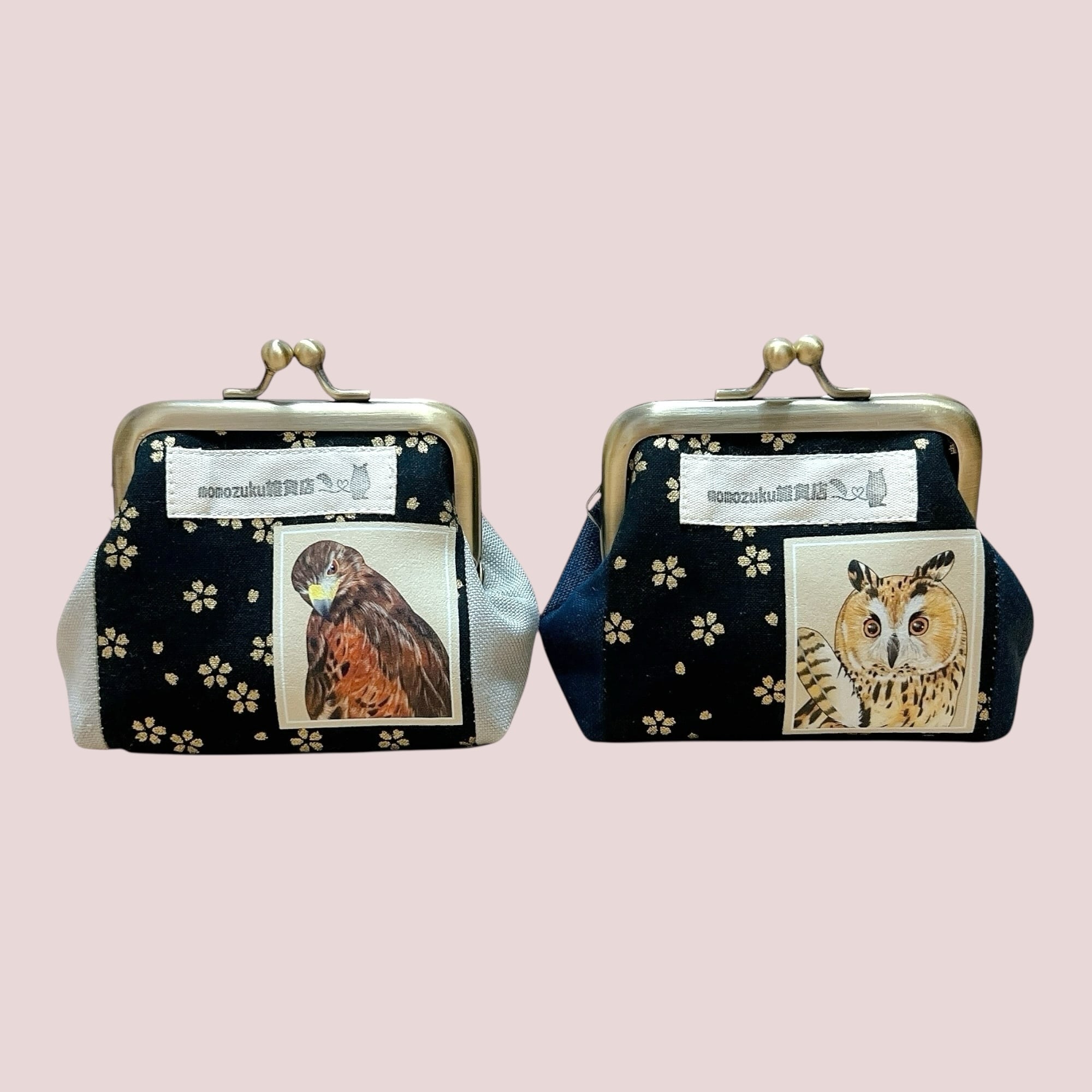 今回はワンポイントでイラストを付けました。また、がま口側面の生地の色と内布はランダムで組み合わせてあります。
