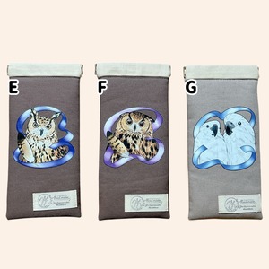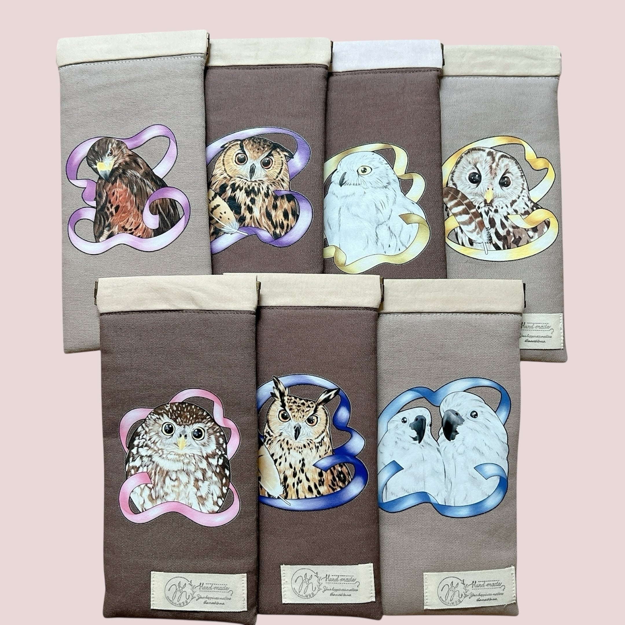 リボンと猛禽のイラストが特徴の眼鏡ケースサイズのポーチです。今回はイラストを目立たせたかったため、本体は茶色の生地でカラーをまとめました。シックな色合いなので男女問わず、使用しやすいと思います。