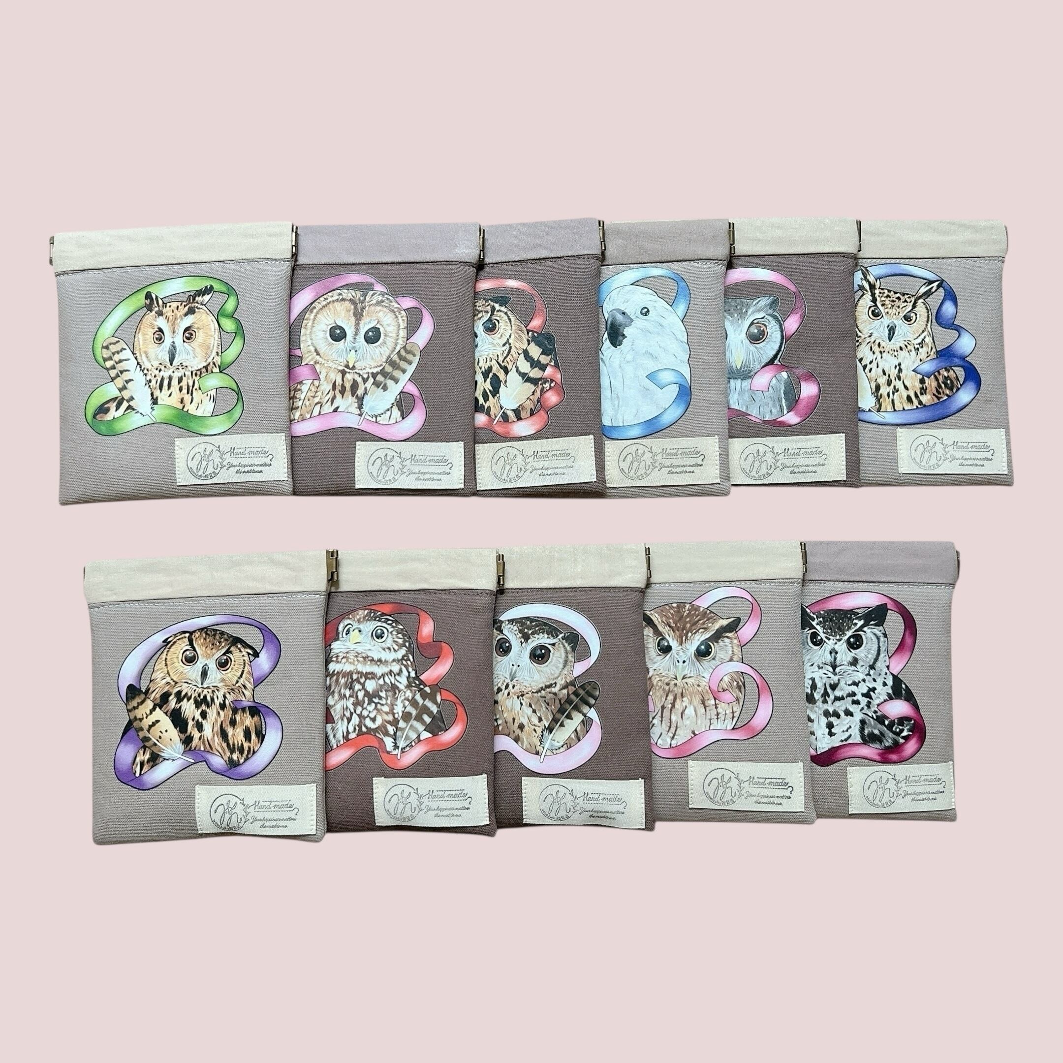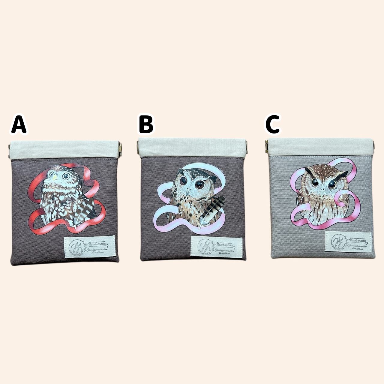 リボンと猛禽のイラストが付いた、正方形のバネポーチです。今回はイラストを目立たせたかったため、本体は茶色の生地でカラーをまとめました。シックな色合いなので男女問わず、使用しやすいと思います。