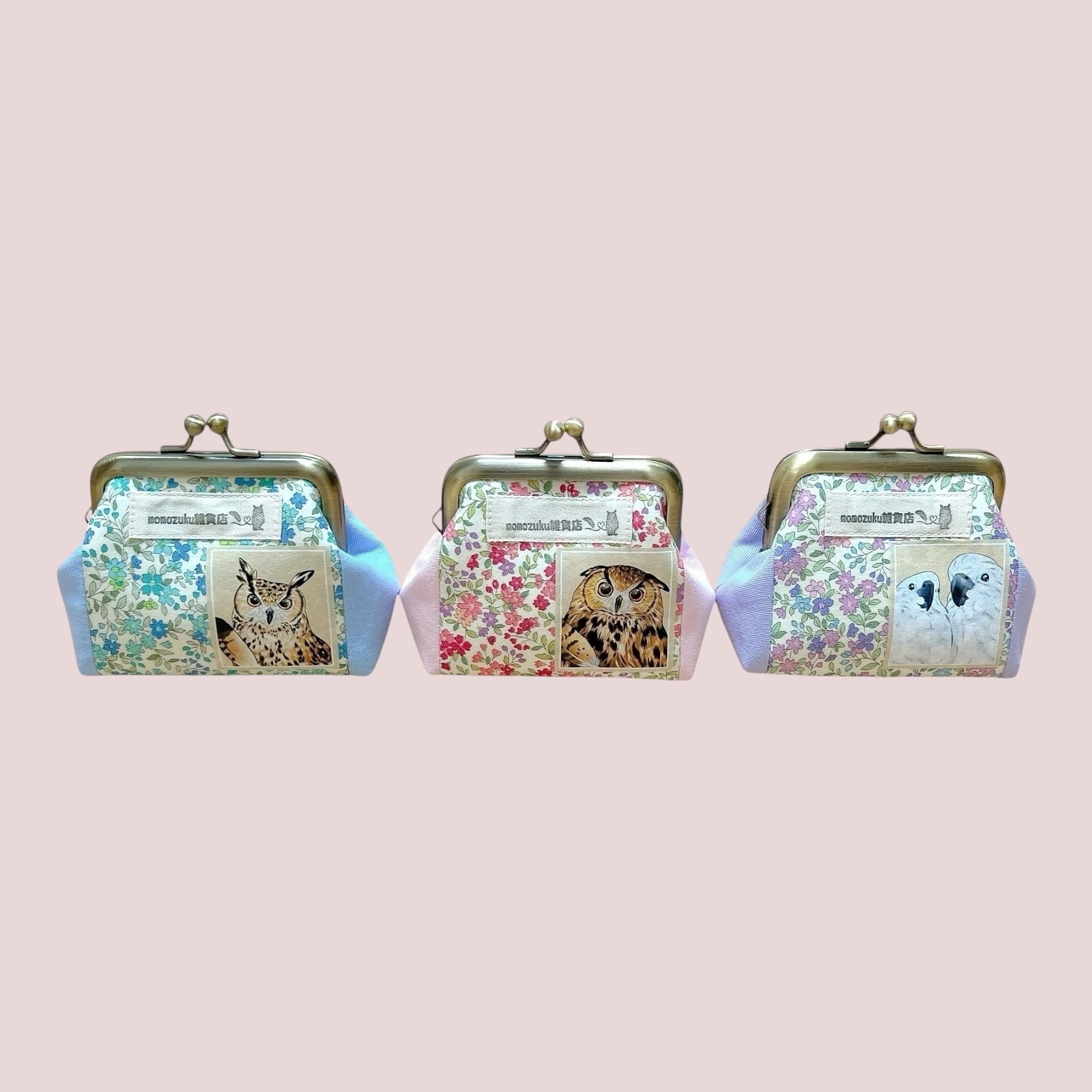 今回はワンポイントでイラストを付けました。また、がま口側面の生地の色と内布はランダムで組み合わせてあります。