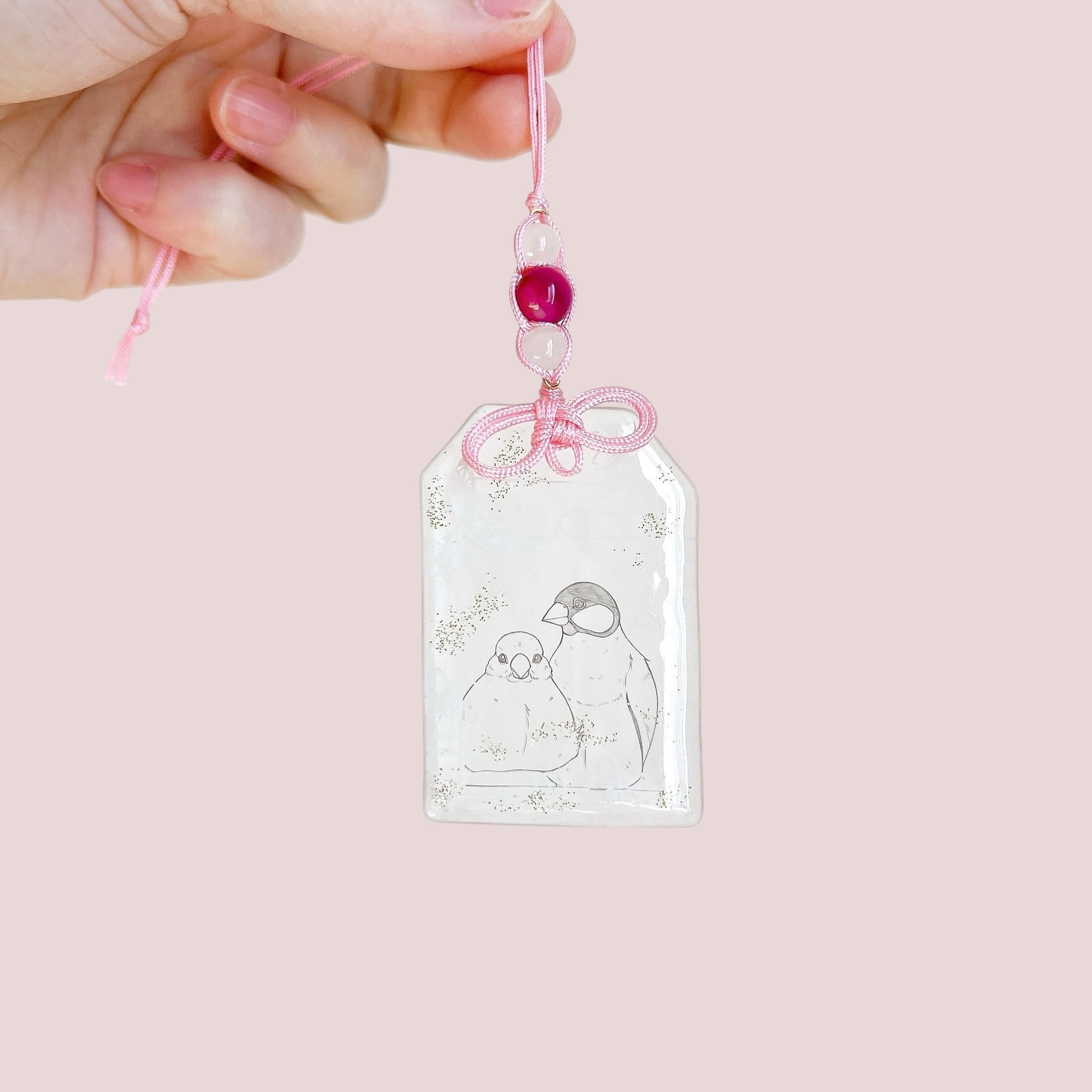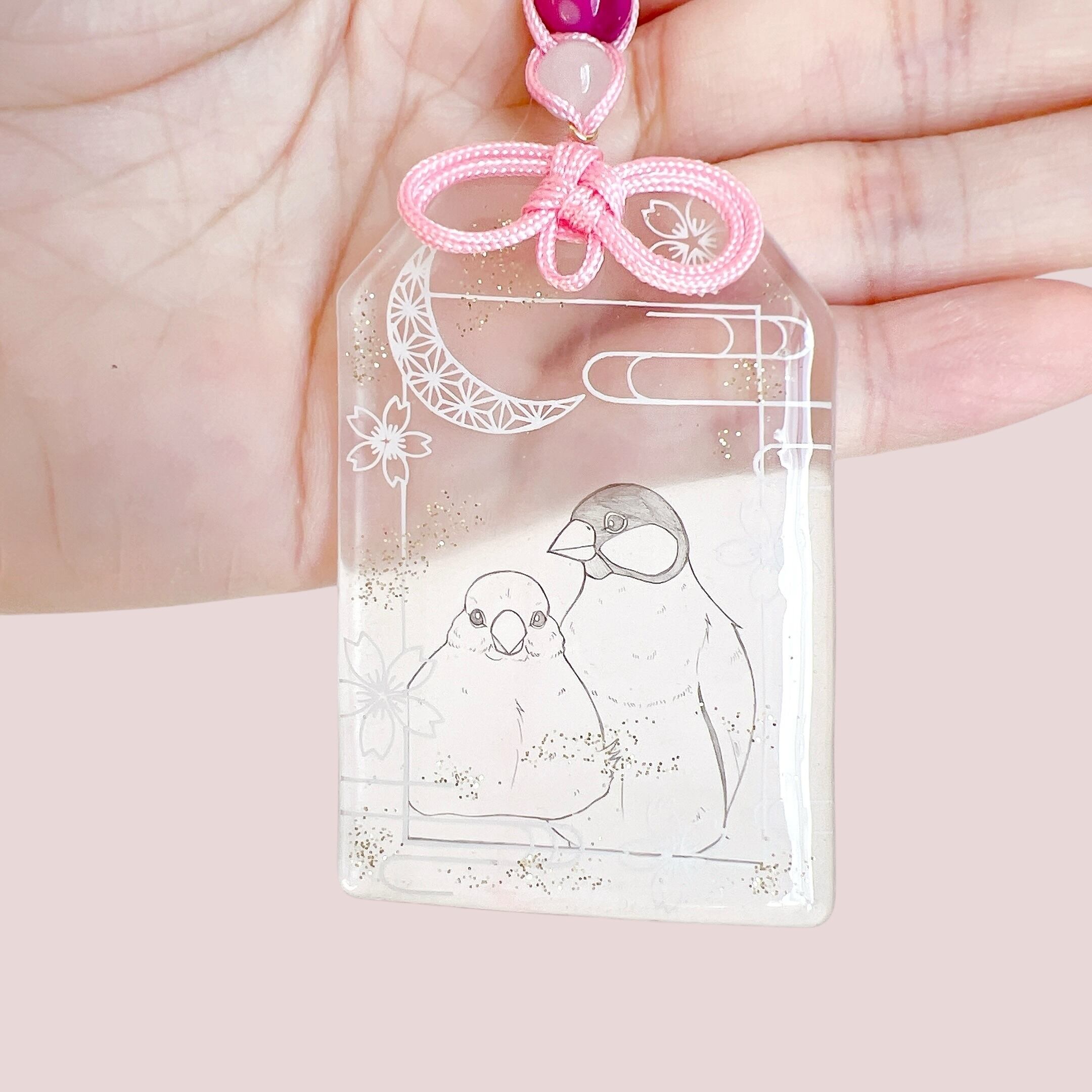 鳥のイラストや柄は全て手描きで製作しており、柔らかい雰囲気を感じられるように仕上げました。レジンでぷっくり艶々、手作り感と透明感の感じられる作品となっていますので、気に入ってもらえたら嬉しいです。