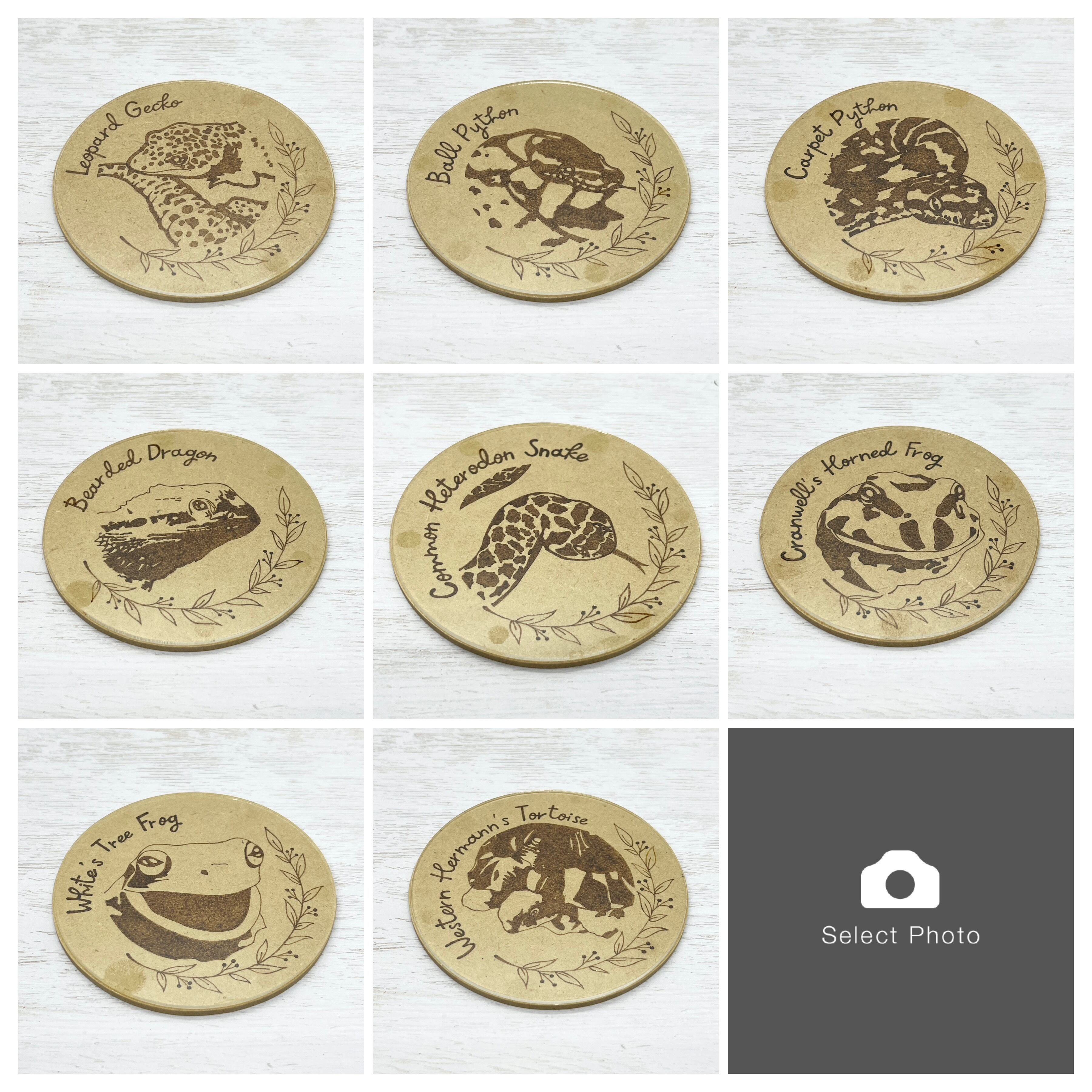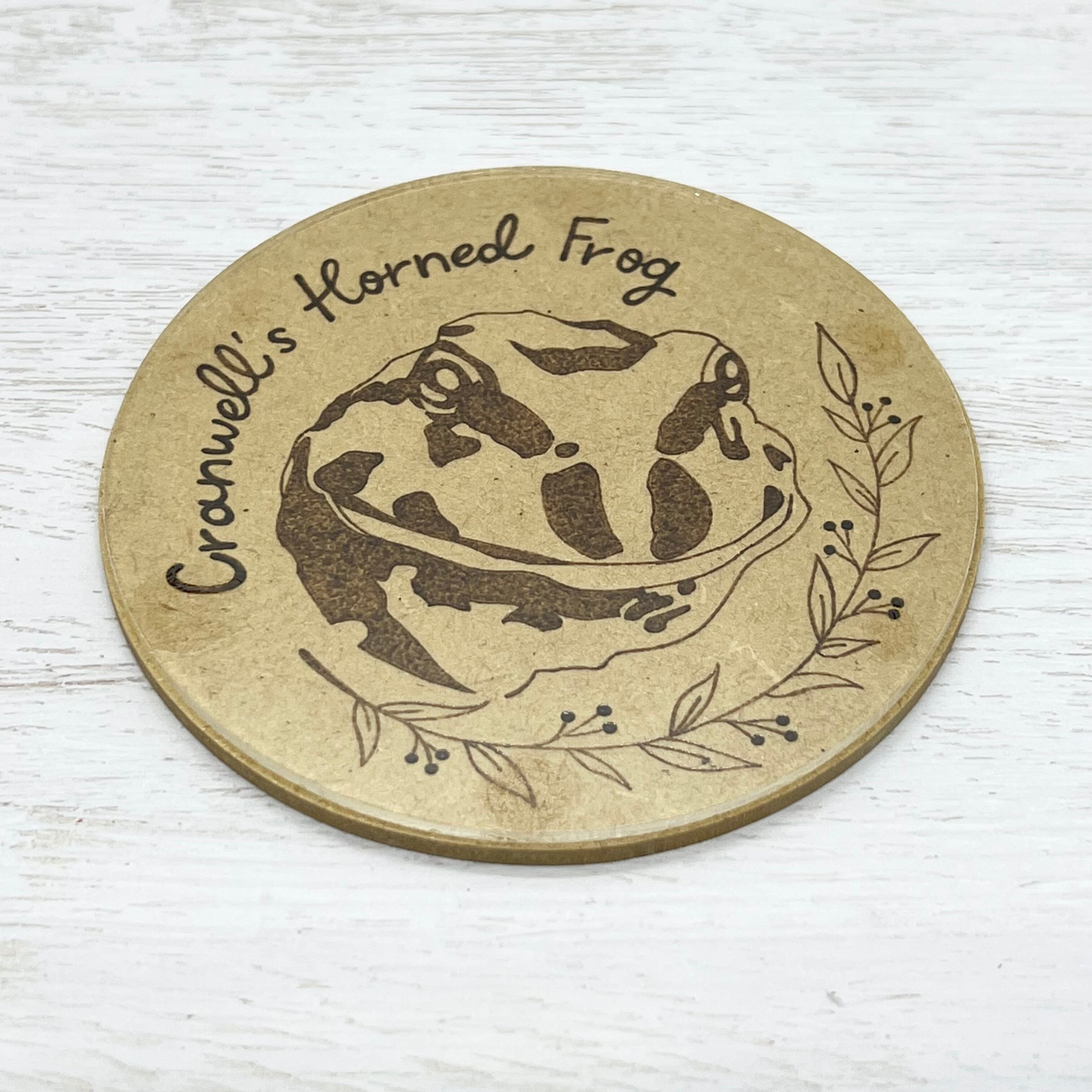 木製のプレート部分にはウッドバーニングで絵を描いてあり、表面にはアクリル板を張り付けてあります。また、木製部分は全面防水加工を施してあるため、吸水するタイプではなく、撥水するタイプのコースターとなっております。