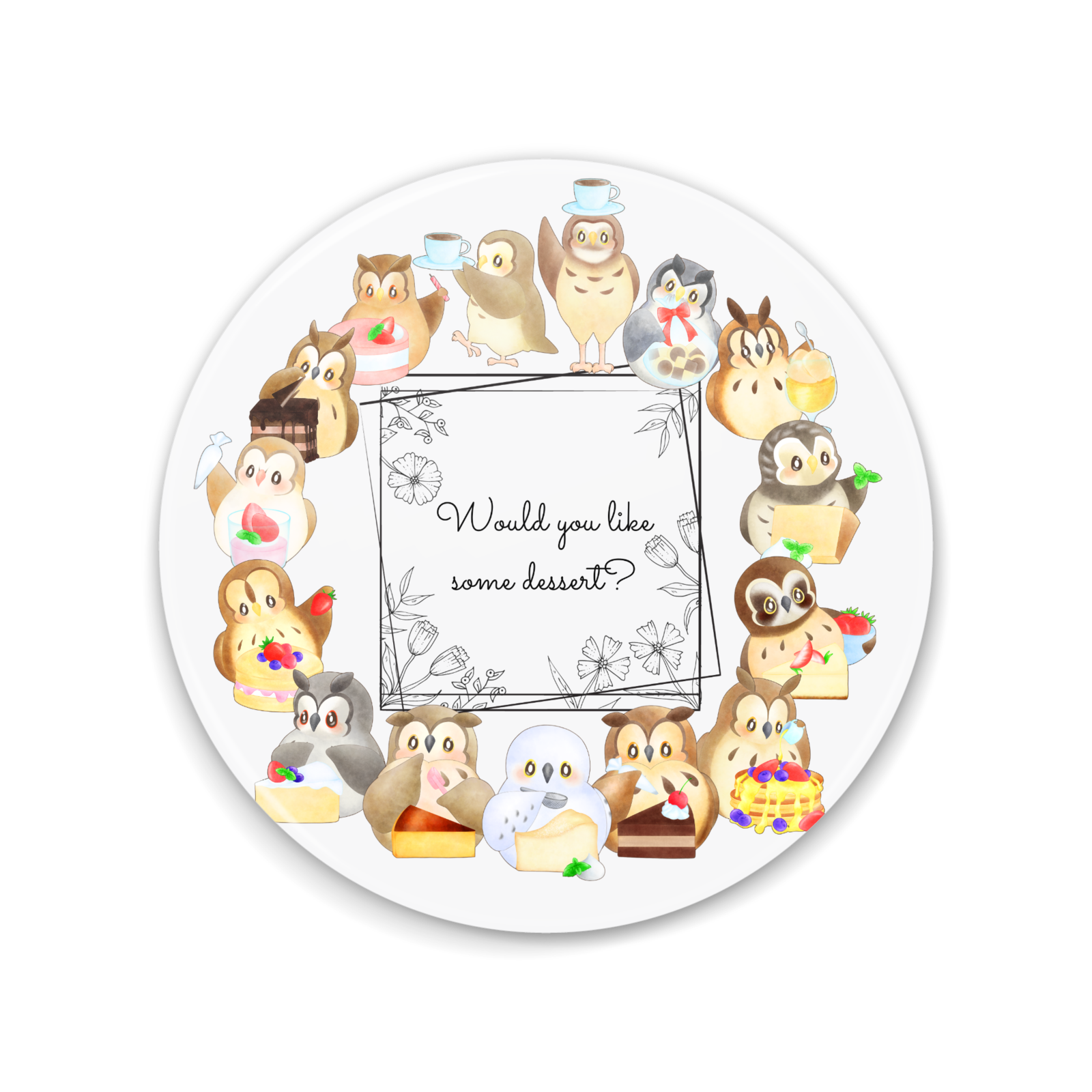 ケーキ等、美味しそうなデザートを作るフクロウ達をデザインした缶ミラーです。