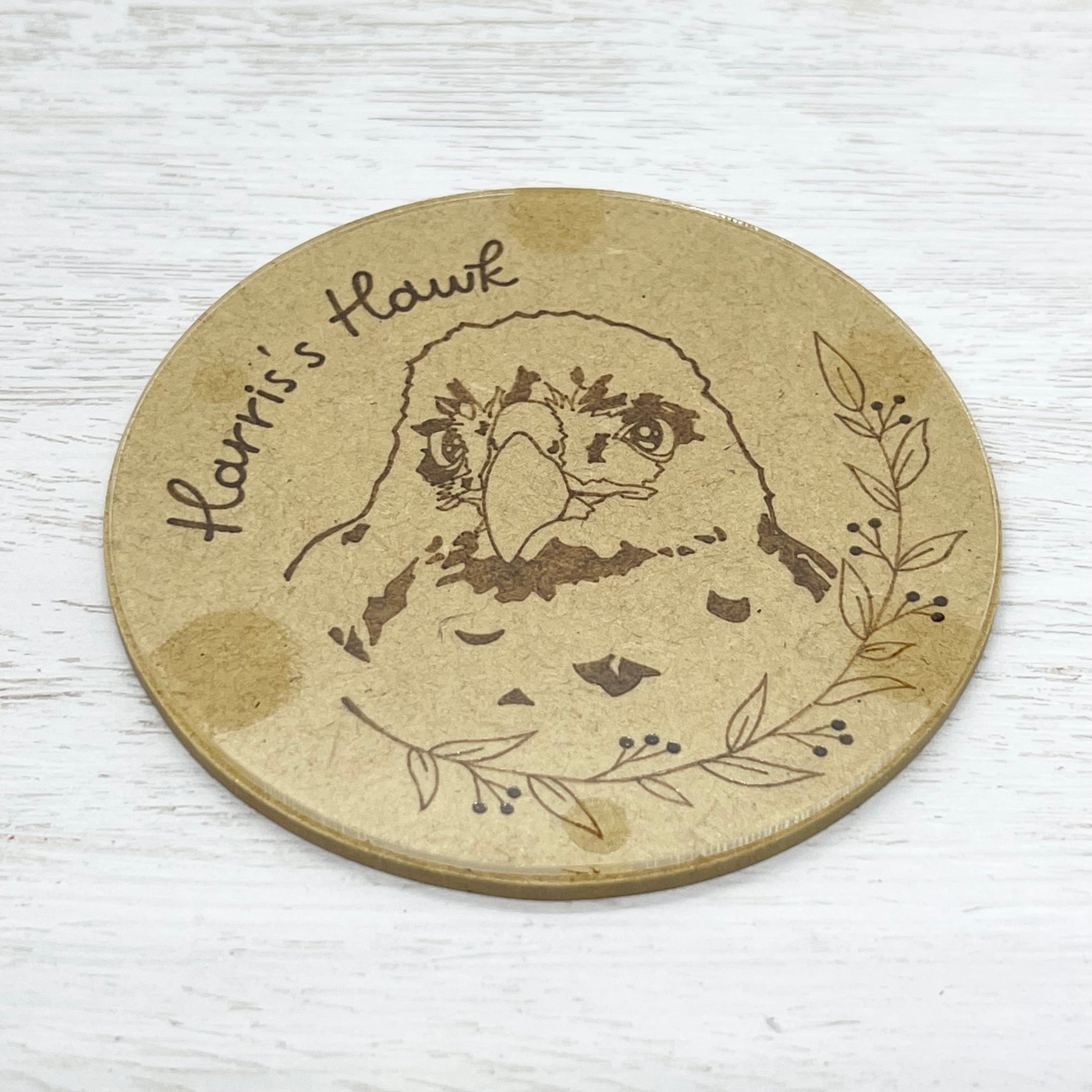 木製のプレート部分にはウッドバーニングで絵を描いてあり、表面にはアクリル板を張り付けてあります。また、木製部分は全面防水加工を施してあるため、吸水するタイプではなく、撥水するタイプのコースターとなっております。