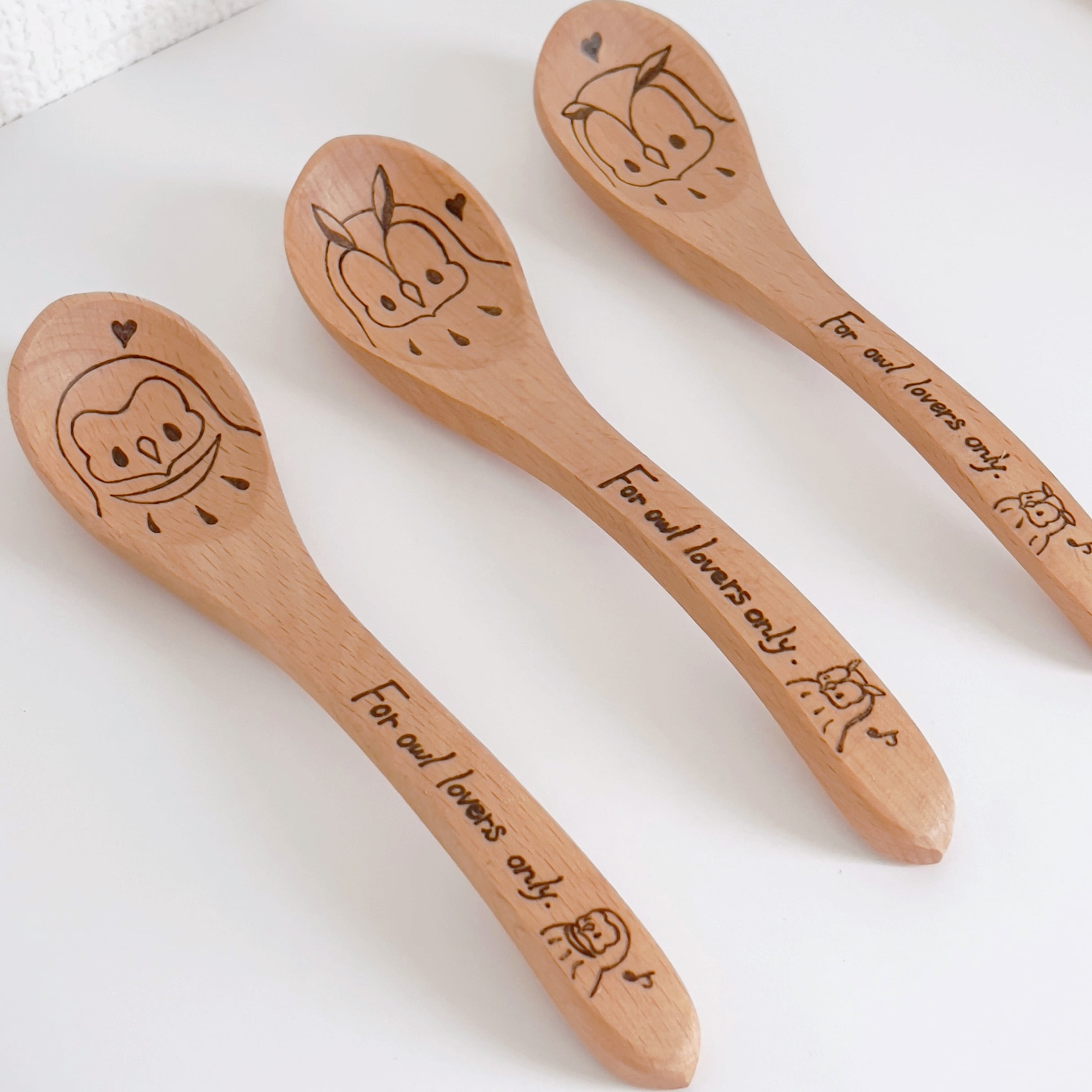 スプーン部分のイラストと持ち手部分のワンポイントイラストは揃えてあります。持ち手部分の文字は「フクロウ好き(愛好家)専用」という意味です(笑)